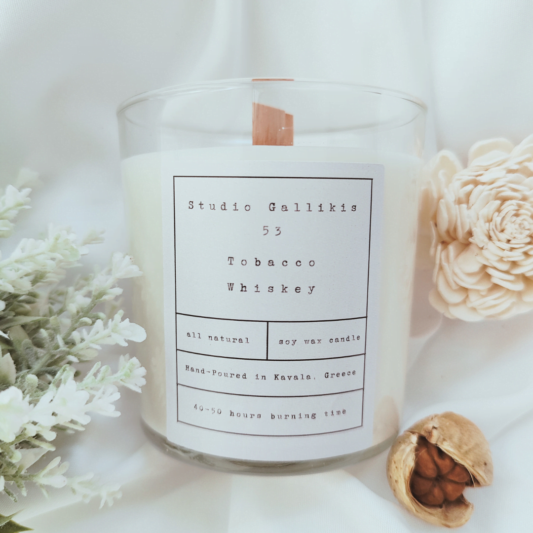 Ανακαλύψτε την απόλυτη αίσθηση εκλεπτυσμένης πολυτέλειας με το Αρωματικό Κερί Σόγιας Tobacco & Whiskey από το Studio Gallikis 53. Με βάρος 240 γραμμάρια και κατασκευασμένο από 100% φυσικό κερί σόγιας, αυτό το κερί προσφέρει έναν μοναδικό συνδυασμό από ζεστές νότες καπνού και πλούσιο άρωμα ουίσκι, δημιουργώντας μια ατμόσφαιρα κομψότητας και άνεσης.
